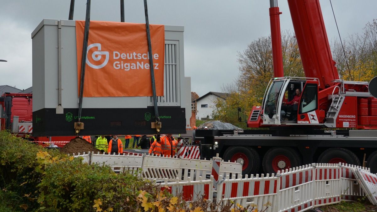 Gegen 11 Uhr erfolgte die Anlieferung des PoP – bereits fertig ausgestattet – durch die Firma UTSolutions auf einem Schwerlast-Tieflader. Parallel wurde ein Mobilkran mit Kontergewichten bestückt, um die Last von über 21 Tonnen anheben zu können. Sören Renner, Regionalleiter Technik, sowie Andreas Damm, Regionalleiter Vertrieb – beide bei der Deutschen GigaNetz –, waren live dabei, um mit Vertretern des Generalunternehmens UT Solutions die Anlieferung und Stellung zu begleiten.