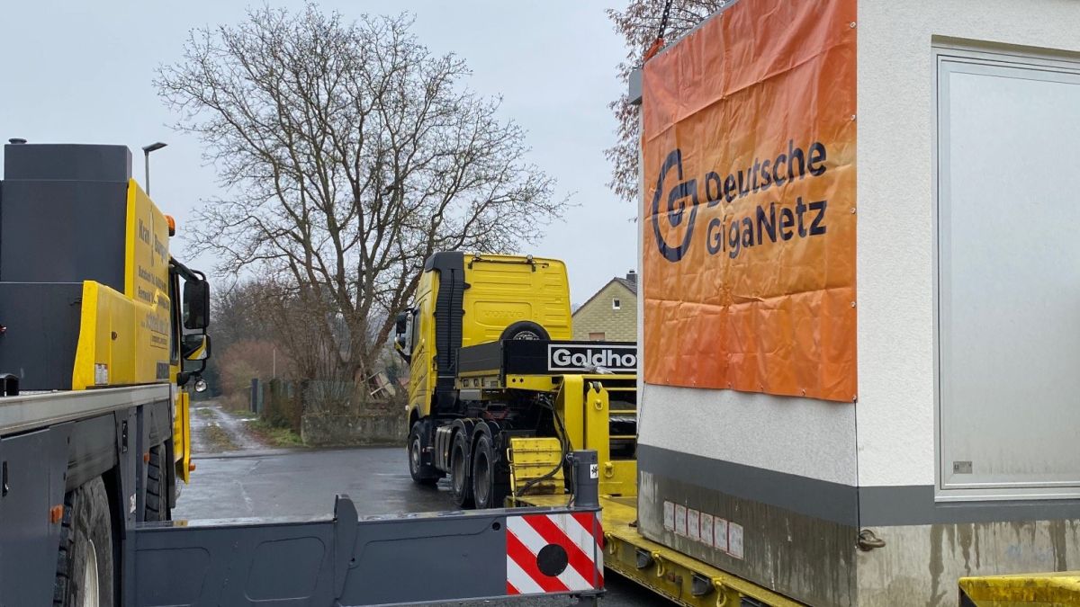 Bereits fertig ausgestattet, erfolgte die Anlieferung des PoP durch die Firma Telent GmbH auf einem Schwerlast-Tieflader. Parallel wurde ein Mobilkran mit Kontergewichten bestückt, um die Last von über 20 Tonnen anheben zu können. Vertreter/innen der Deutschen GigaNetz waren live dabei, um die Anlieferung und Stellung zu begleiten. Als nächste Schritte werden die Leerrohre für die spätere Glasfasereinführung angeschlossen und der entstandene Graben mit Erde verfüllt. Nachdem die Stadt Nidda fertig ausgebaut ist, nimmt der PoP die Arbeit auf. “In diesem Jahr konnte bereits der 1. Bauabschnitt in der Stadt Nidda abgeschlossen werden. So wurden beispielweise Teile von Unter-Widdersheim sowie vom Stadtkern Nidda fertiggestellt. Das Stellen des ersten PoP Containers bringt die Stadt Nidda dem schnellen Internet wieder einen Schritt näher. Nach der Winterpause starten wir im Frühjahr 2023 mit dem weiteren Ausbau im 2. Bauabschnitt”, berichtet Max Summa, Projektleiter bei der Deutschen GigaNetz.