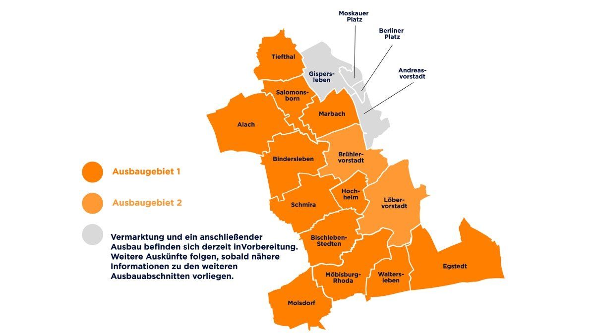 Die Deutsche GigaNetz GmbH setzt ihre ambitionierten Pläne zur Digitalisierung in Erfurt entschlossen fort: Nach dem sogenannten „Ausbaugebiet 1“ mit Alach, Bischleben-Stedten, Bindersleben, Egstedt, Hochheim, Marbach, Möbisburg-Rhoda, Molsdorf, Salomonsborn, Schmira, Tiefthal und Waltersleben können sich nun auch die Bürgerinnen und Bürger in Brühlervorstadt und Löbervorstadt für einen zukunftsfähigen Glasfaseranschluss entscheiden. Bei ausreichend hoher Nachfrage von etwa 35 Prozent der Haushalte und Unternehmen kann der Aufbau eines entsprechenden Glasfasernetzes von Seiten des Telekommunikationsunternehmens komplett eigenwirtschaftlich, sprich ohne staatliche oder lokale Fördermittel, umgesetzt werden.
