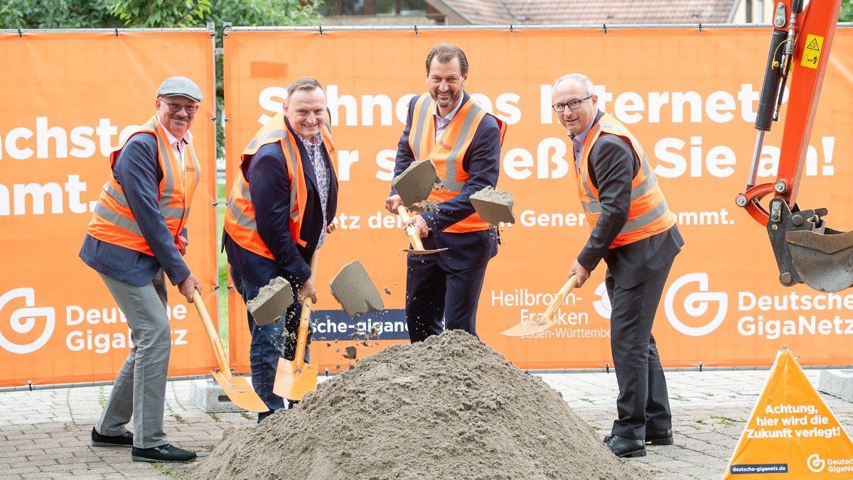 Den ersten symbolischen Spatenstich setzten gestern Bürgermeister Martin Piott sowie weitere Vertreterinnen und Vertreter der Gemeinde zusammen mit Dr. Andreas Schumm, Geschäftsführer der Wirtschaftsregion Heilbronn-Franken GmbH, Wolfram Thielen, Mitgründer und Geschäftsführer Roll Out Management der Deutschen GigaNetz, und Martin Herkommer, Leiter Strategische Geschäftsent-wicklung Region Süd bei der Deutschen GigaNetz, direkt hinter dem Rathaus in der Adolzfurter Straße. Damit starten offiziell die Ausbauarbeiten für das neue Glasfasernetz in Bretzfeld. Die Gemeinde und das Telekommunikationsunternehmen wollen bis Ende 2024 den Ausbau mit Glasfaseranschlüssen direkt bis in die Wohn- und Geschäftsgebäude realisieren. Das Infrastrukturvorhaben wird dabei von der Deutschen GigaNetz eigenwirtschaftlich und somit ohne Fördermittel umgesetzt.