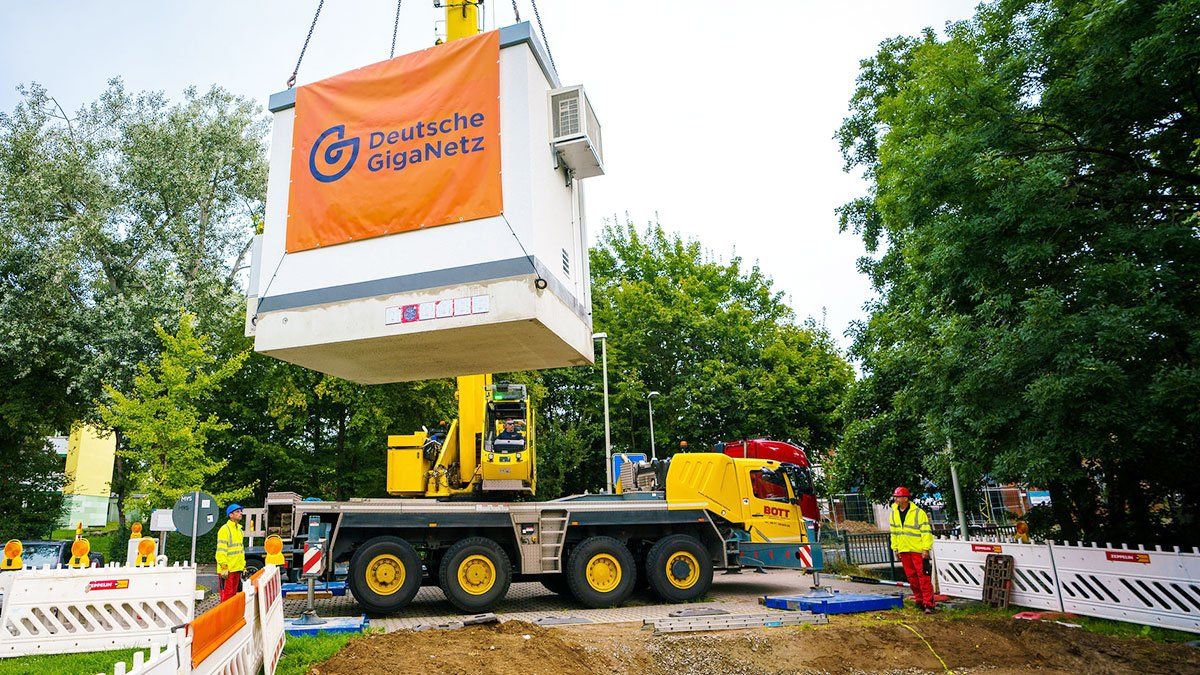 Gegen 6:30 Uhr erfolgte die Anlieferung des POPs – bereits fertig ausgestattet – durch die Firma Telent GmbH auf einem Schwerlast-Tieflader. Parallel wurde ein Mobilkran mit Kontergewichten bestückt, um die Last von über 11 Tonnen anheben zu können. Dr. Bernd Blisch, Bürgermeister der Stadt Flörsheim, sowie Holger Woerner, Leiter Eigenbetriebe Stadtwerke und Stadthallen, waren live dabei, um zusammen mit Vertretern des Ingenieurbau-Unternehmens Wayss & Freytag sowie der Deutsche GigaNetz die Anlieferung und Stellung zu begleiten. Als nächste Schritte werden die Leerrohre für die spätere Glasfasereinführung angeschlossen und der entstandene Graben mit Erde verfüllt. Nachdem die Wohngebiete Weilbach und Bad Weilbach fertig ausgebaut sind, nimmt die Technik im PoP für die Regionen die Arbeit auf.